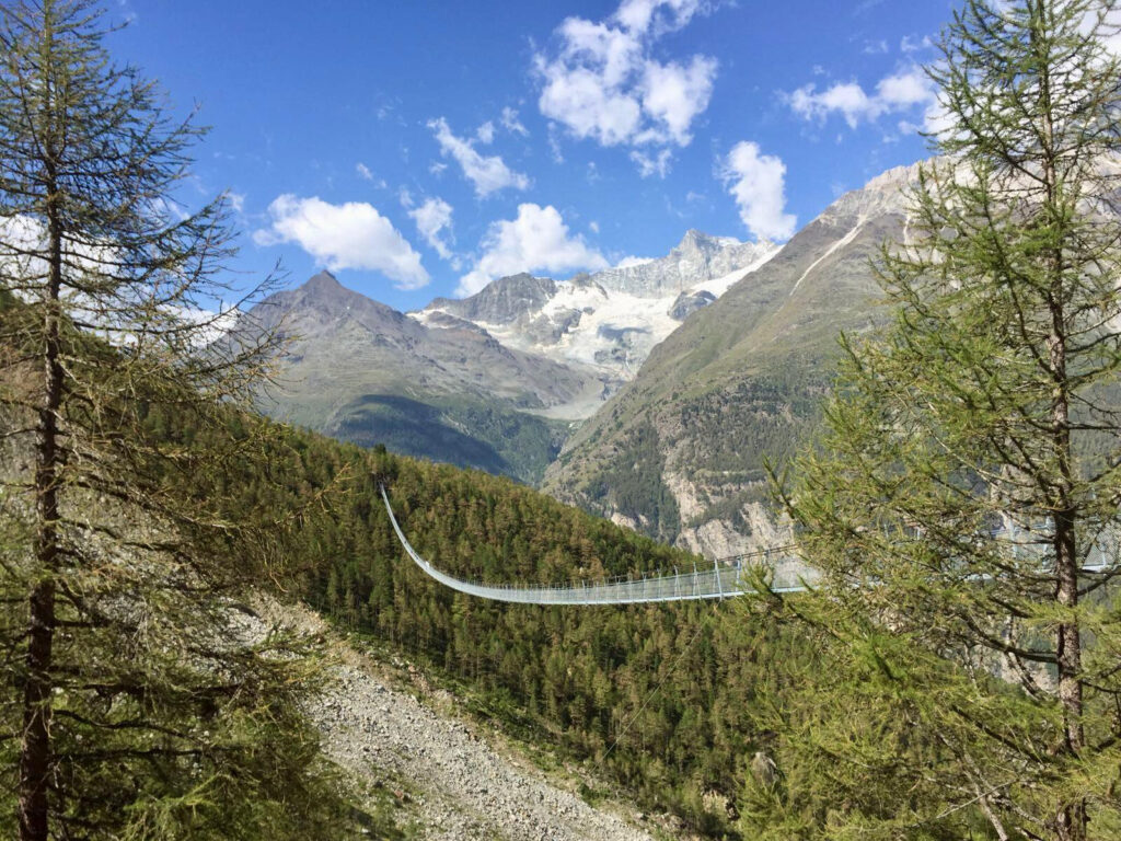 Ein absolutes Muss und nur einen Steinwurf entfernt ist die Charles Kuonen Hängebrücke. Mit ihren schwindelerregenden 494 Metern Länge ist sie die längste Fussgänger-Hängebrücke der Alpen. Die Überquerung in 85 Metern Höhe ist ein unvergessliches Erlebnis, das dir nicht nur einen Adrenalinkick, sondern auch eine spektakuläre Aussicht auf das Weisshorn und das Mattertal beschert. Ein Highlight für jeden, der beim Camping am Europaweg unterwegs ist.
